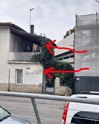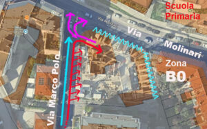 Accessi carrai multipli, utilizzando via Marco Polo come spazio di manovra degli automezzi. Le freccette in azzurro indicano le aperture previste nel progetto al Piano Terra e al Piano Primo, nella zona garage, per la fuoriuscita dei gas di scarico degli automezzi verso il marciapiede, verso l’abitazione confinante e verso i giardini delle case dell’ex Cavalleria, tutta area di interesse storico architettonico-tipologico “Zona B0”.