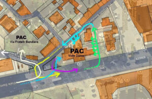 che si genererà con i nuovi palazzi a sviluppo verticale, i PAC (progetti ambientali di cantierizzazione) propongono un tipo di organizzazione infrastrutturale inglobando l’area di proprietà comunale e sistemandola con una viabilità di larghezza di m 4.00 più un solo marciapiede.
