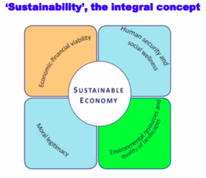 Sostenibilità implica preclusione della discontinuità di un sistema e conseguentemente prevenzione dal suo degrado. È un concetto abbastanza minimalista. Significa procedere accumulando valore e non disvalore. Ciò si può ottenere puntando sulla cura e l’equilibrio di quattro dimensioni dell’attività umana.