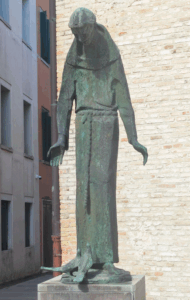 La statua in bronzo dedicata a San Francesco di Pierino Sam, un tempo collocata sopra una fontana in Piazza della Motta e successivamente, dopo i lavori di ristrutturazione del complesso dell’ex convento di San Francesco, ricollocata accanto all’attuale ingresso principale della chiesa a ricordo del fondatore dell’Ordine dei Frati Minori, ha le braccia protese verso una colomba ai suoi piedi. E’ una presenza silenziosa, ma fortemente evocativa; con la sua postura raccolta e pacata emana un senso di pace austera, quasi un abbraccio interiore al visitatore.