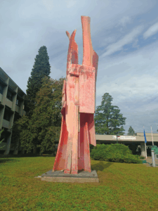 Per concludere la scultura astratta intitolata “Kennedy” del 1973/74 in ferro dipinto con minio di Dino Basaldella nel giardino dell’Istituto Tecnico Industriale “J.F. Kennedy” e visibile anche dall’esterno, una imponente struttura totemica alta quasi sei metri di arcaica forza espressiva. Le opere diventano presenze che mettono in dialogo storia e contemporaneità con la comunità che vive il contesto urbano e che riescono ad interagire con gli spazi trasformando o rafforzando l’identità dei luoghi che abitano attraverso i linguaggi del proprio tempo.